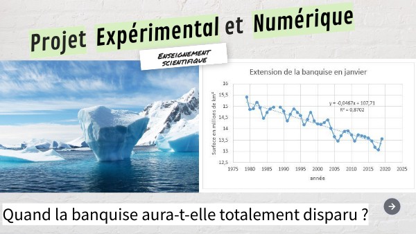 L'évolution de la banquise est un indicateur du réchauffement climatique. A travers ce projet expérimental numérique nous allons étudier cette évolution à partir de data mais aussi expérimenter quelques facteurs influençant cette évolution.
