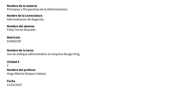 Nombre de la tarea Uso de enfoque administratico en empresa Burger King