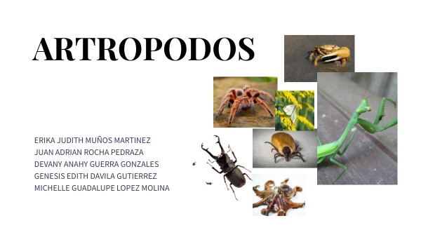 CARACTERÍSTICAS DE LOS ARTRÓPODOS ❏ Presentar un cuerpo con articulaciones, formado por segmentos (tagmas) y apéndices especializados. ❏ Tener un exoesqueleto de quitina que les sirve de protección y soporte ❏ Respirar mediante un sistema traqueal o por branquias, según su hábitat. ❏ Alimentarse de distintas fuentes, como plantas, animales o materia orgánica . ❏ Reproducirse sexualmente, con fecundación interna o externa.
