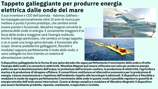 Il suo inventore e CEO dell’azienda – Adamos Zakheos – ha impiegato personalmente oltre 10 anni di ricerca per mettere a punto il primo prototipo, che sembra ormai essere pronto e funzionale. Waveline magnet converte la potenza delle onde in energia. E ovviamente maggiore è la forza delle onde e maggiore sarà l’energia restituita. Anche il design particolare, che sembra un lungo tappeto, o se si vuole una lunga spina dorsale, è funzionale allo scopo. Diverse piattaforme galleggianti, flessibili e modulari seguono perfettamente il moto delle onde, e sono collegate tra loro tramite un sistema di alimentazione centrale.
