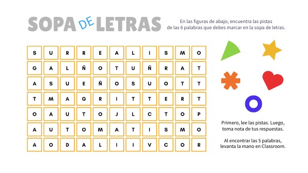 Primero, lee las pistas. Luego, toma nota de tus respuestas. Al encontrar las 5 palabras, levanta la mano en Classroom.