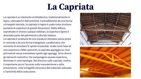 La capriata è un elemento architettonico, tradizionalmente in legno, utilizzato fin dall’antichità. Contraddistinta da una forma a triangolo isoscele, la capriata in legno è usata come struttura portante di coperture di grandi dimensioni. Molto diffusa, soprattutto in chiese e palazzi nobiliari, la copertura lignea è diventata parte del patrimonio culturale italiano. La capriata è costituita da una travatura reticolare piana posta in verticale e da una forma triangolare, caratteristica che consente di annullare le spinte orizzontali. Usata come base di una copertura a falde spioventi, la capriata appoggia sui muri perimetrali senza trasmettere spinte agli appoggi. Sono diversi gli elementi costruttivi che compongono questa copertura, declinata in varie tipologie. Nel discorso sulle capriate, inoltre, è importante porre l’accento sulla manutenzione e sulla prevenzione, vista la fragilità intrinseca del materiale utilizzato e l’antichità della costruzione.