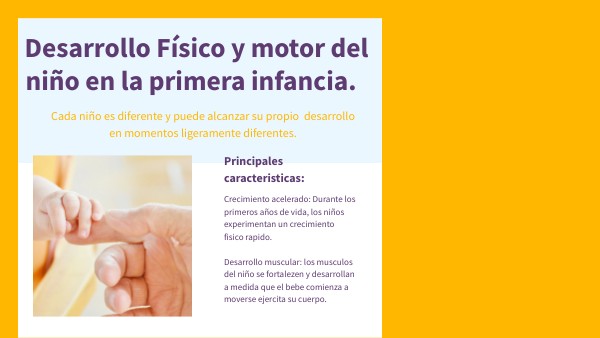 Crecimiento acelerado: Durante los primeros años de vida, los niños experimentan un crecimiento fisico rapido. Desarrollo muscular: los musculos del niño se fortalezen y desarrollan a medida que el bebe comienza a moverse ejercita su cuerpo.
