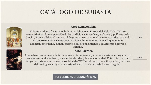 Equipo editorial, Etecé (2022) Renacimiento Recuperado de https://concepto.de/renacimiento/ Cabrera. GL (2022) El Infierno (según Dante). Historia-arte.com. Recuperado de https://historia-arte.com/obras/el-infierno-segun-dante#:~:text=La%20idea%20del%20Infierno%20ya,castigo%20para%20toda%20la%20eternidad. Calvo, SM (2015) Expulsión del Paraíso. Historia-arte.com. Recuperado de https://historia-arte.com/obras/expulsion-del-paraiso-de-miguel-angel Iborio E., (2017) El David de Miguel Ángel. Historia-arte.com. Recuperado de https://historia-arte.com/obras/el-david-de-miguel-angel Poveda, L. (2019) Moisés. Historia-arte.com. Recuperado de https://historia-arte.com/obras/moises S/N (2017) Arquitectura del Quattrocento. La historia y otros cuentos. Recuperado de http://lahistoriayotroscuentos.es/arquitectura-del-quattrocento/ Departamento de Geografía e Historia (2008-2009) Tema 8: Tema 8: Arquitectura del Quattrocento: Brunelleschi y Alberti. Historia del Arte. Recuperado de https://www.eduguro.org/arte/wp-content/uploads/2013 Aceves, C. (2021) Santa Cecilia. Historia-arte.com. Recuperado de https://historia-arte.com/obras/santa-cecilia Cabrera, G. L. (2021) Bodegón de quesos, alcachofa y cerezas. Historia-arte.com. Recuperado de https://historia-arte.com/obras/bodegon-de-quesos-alcachofa-y-cerezas Calvo, S. M. (2022) La peste. Historia-arte.com. Recuperado de https://historia-arte.com/obras/peste-zumbo Summerfall, W.(2017) Hermafrodito durmiente. Historia-arte.com. Recuperado de https://historia-arte.com/obras/hermafrodito-durmiente S/N (S/F) Basílica de Santa Maria della Salute. megaconstrucciones.net Recuperado de https://megaconstrucciones.net/?construccion=basilica-santa-maria-della-salute López, P. (2015) Joyas del Barroco en el siglo XVII. Arte y Diamantes. Recuperado de https://arteydiamantes.com/joyas-del-barroco-en-el-siglo-xvii/ S/N (S/F) La Joya en el Barroco. CASTMAY Recuperado de https://www.castmay.com/la-joya-en-el-barroco Rodríguez, A. (2022) Iglesia de San Carlo alle Quattro Fontane. En roma. Recuperado de https://www.enroma.com/iglesia-de-san-carlo-alle-quattro-fontane/ S/N (S/F) Arquitectura Barroca. Arquitectura Pura. Recuperado de https://www.arquitecturapura.com/arquitectura/barroca-4951/