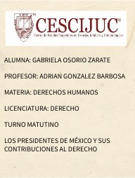 ALUMNA: GABRIELA OSORIO ZARATE PROFESOR: ADRIAN GONZALEZ BARBOSA MATERIA: DERECHOS HUMANOS LICENCIATURA: DERECHO TURNO MATUTINO LOS PRESIDENTES DE MÉXICO Y SUS CONTRIBUCIONES AL DERECHO