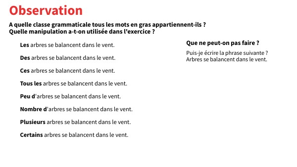 Précise si les mots en gras dans les phrases suivantes sont des déterminants – aide-toi de la manipulation du remplacement par un déterminant connu. Quels sont les mots intrus ?