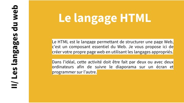 Le HTML est le langage permettant de structurer une page Web, c'est un composant essentiel du Web. Je vous propose ici de créer votre propre page web en utilisant les langages appropriés. Dans l'idéal, cette activité doit être fait par deux ou avec deux ordinateurs afin de suivre le diaporama sur un écran et programmer sur l'autre.