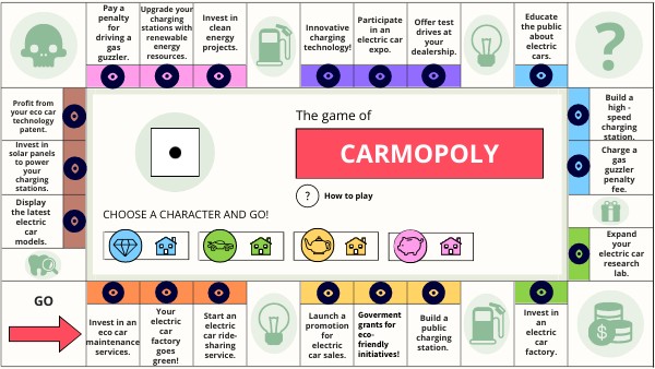 1. Players choose a character, take turns rolling the dice to move around the board.2. The board includes various spaces such as charging stations, eco car expos, and other eco car-related events. 3 .When landing on an event space, press the eye and follow the instructions, which may involve educational questions or other eco car-themed challenges. 4. The player has 1000 carmopoly dollars. On each even space the player gains, loses or neither. Instructions on how much the player gains/loses are in the question. 5. It's the best to grab a piece of paper and follow your money balance but that's not necessary, you can count in your own mind. 6. On event spaces with icons you can either get a question, get useful informtion or get lucky/unlucky. 7. The player with the most money at the end of the round wins, symbolizing their success in promoting electric cars and their advantages.