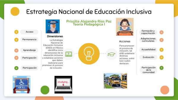 La Estrategia Nacional de Educación Inclusiva (ENEI) en México identifica cinco dimensiones de la educación inclusiva y establece acciones que deben realizarse para promover el proceso de inclusión.
