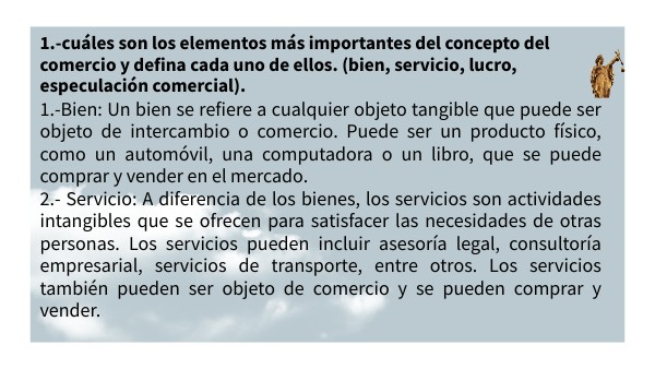 1.-cuáles son los elementos más importantes del concepto del comercio y defina cada uno de ellos. (bien, servicio, lucro, especulación comercial).