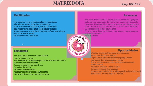 Alto costo de los insumos , harina , azucar, chocolate , grangeas sfalta de una maquina de donitas extras , ya que solo se cuenta con una y si llegara a fallar seria una amenza para la produccion otros carritos con donas ubicados en la misma zona de ventas LEl tiempo lluvia, temperaturas altas El consumo de dulce es limitado y en algunos casos personas no pueden consumir . fallas electricas