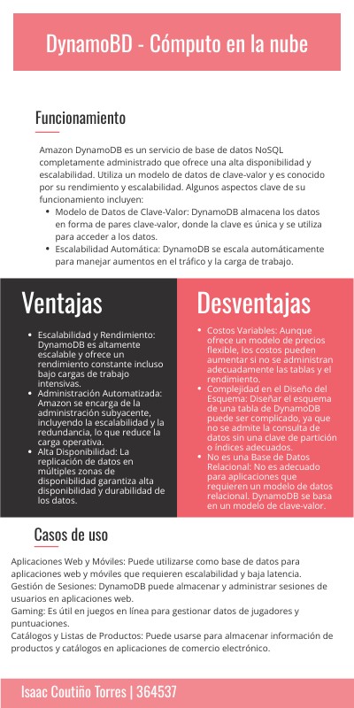 - No es una Base de Datos Relacional: No es adecuado para aplicaciones que requieren un modelo de datos relacional. DynamoDB se basa en un modelo de clave-valor.