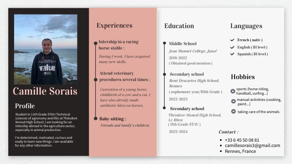 Student in 11th Grade STAV (Technical sciences of agronomy and life) at Théodore Monod High School, I am looking for an intership abroad in the agriculture sector, especially in animal production.