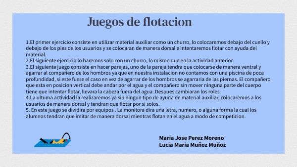 1.El primer ejercicio consiste en utilizar material auxiliar como un churro, lo colocaremos debajo del cuello y debajo de los pies de los usuarios y se colocaran de manera dorsal e intentaremos flotar con ayuda del material. 2.El siguiente ejercicio lo haremos solo con un churro, lo mismo que en la actividad anterior. 3.El siguiente juego consiste en hacer parejas, uno de la pareja tendra que colocarse de manera ventral y agarrar al compañero de los hombros ya que en nuestra instalacion no contamos con una piscina de poca profundidad, si este fuese el caso en vez de agarrar de los hombros se agarraria de las piernas. El compañero que esta en posicion vertical debe andar por el agua y el compañero sin mover ninguna parte del cuerpo tiene que intentar flotar, llevara la cabeza fuera del agua. Despues cambiaran los roles. 4.La ultuma actividad la realizaremos ya sin ningun tipo de ayuda de material auxiliar, colocaremos a los usuarios de manera dorsal y tendran que flotar por si solos.5. En este juego se dividira por equipos . La monitora dira una letra, numero, o alguna forma la cual los alumnos tendran que imitar de manera dorsal mientras flotan en el agua a modo de competicion.