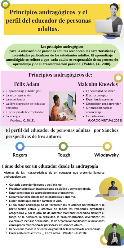 Los principios andragógicos para la educación de personas adultas reconocen las características y necesidades particulares de los estudiantes adultos. El aprendizaje autodirigido se refiere a que cada adulto es responsable de su proceso de aprendizaje y de su transformación personal (Valdez, J.C. 2018).