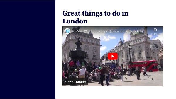 The video is about London, the capital city of England. It mentions that there are many great things to do in London, such as visiting museums like the Natural History Museum and the British Museum. Buckingham Palace and the London Eye are also famous attractions. The video highlights the London Zoo and Madame Tussauds as popular places to visit. Overall, the video portrays London as a fun and exciting city with lots of activities for both kids and adults.