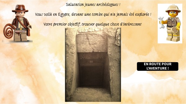 Salutation jeunes archéologues ! Vous voilà en Egypte, devant une tombe qui n'a jamais été explorée ! Votre premier objectif, trouver quelque chose d'intéressant .