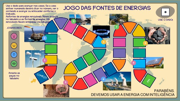 Use o dado para avançar nas casas. Se a casa estiver numerada deverá clicar no número, ver o conteúdo e avançar ou retroceder conforme o indicado. Asfontes de energias renováveis fazem avançar no tabuleiro e as fontes de energias não renováveis fazem retroceder no tabuleiro.