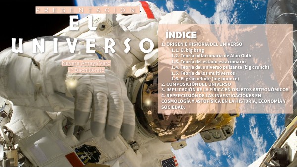 1. ORIGEN E HISTORIA DEL UNIVERSO1.1. El big bang1.2. Teoría inflacionaria de Alan Guth1.3. Teoría del estado estacionario1.4. Teoría del universo pulsante (big crunch)1.5. Teoría de los multiversos1.6. El gran rebote (big bounce)2. COMPOSICIÓN DEL UNIVERSO3. IMPLICACIÓN DE LA FÍSICA EN OBJETOS ASTRONÓMICOS 4. REPERCUSIÓN DE LAS INVESTIGACIONES EN COSMOLOGÍA Y ASTOFÍSICA EN LA HISTORIA, ECONOMÍA Y SOCIEDAD.