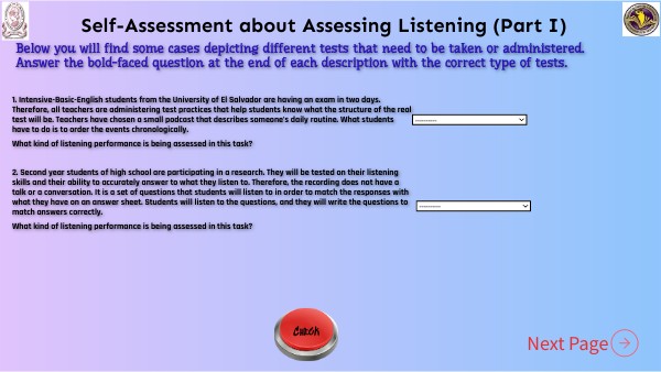 1. Intensive-Basic-English students from the University of El Salvador are having an exam in two days. Therefore, all teachers are administering test practices that help students know what the structure of the real test will be. Teachers have chosen a small podcast that describes someone’s daily routine. What students have to do is to order the events chronologically. What kind of listening performance is being assessed in this task? 2. Second year students of high school are participating in a research. They will be tested on their listening skills and their ability to accurately answer to what they listen to. Therefore, the recording does not have a talk or a conversation. It is a set of questions that students will listen to in order to match the responses with what they have on an answer sheet. Students will listen to the questions, and they will write the questions to match answers correctly. What kind of listening performance is being assessed in this task?