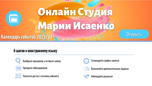 - 7% при покупке абонемента из 10-ти занятий по следующим программам: Индивидуальная программа, Иностранный язык и социокультура, Грамматика: просто о сложном. Скидка 5% при оплате абонемента из 5-ти занятий по этим же программам.