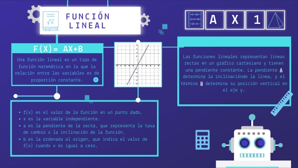 Las funciones lineales representan líneas rectas en un gráfico cartesiano y tienen una pendiente constante. La pendiente A determina la inclinaciónde la línea, y el término B determina su posición vertical en el eje y.