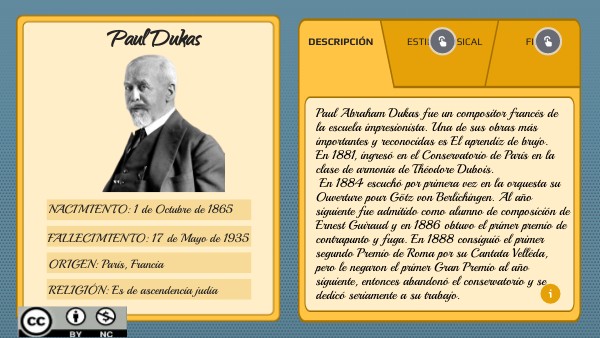 1. Paul Dukas fue un compositor Francés, nació en el año _______ y murió en el año ________. (1 punto)2. Dos de sus obras más reconocidas son la SINFONÍA EN DO MAYOR y _________. (1,5 puntos) 3. ¿En que año ingresó a su primer conservatorio? ____________ (2 puntos) 4. ¿Cuáles son sus estilos musicales? ________________ (1,5 puntos) 5. ¿Para qué está instrumentada la SINFONÍA EN DO MAYOR? ____________ (2 puntos) 6. ¿Para qué está instrumentada EL APRENDIZ DEL BRUJO? __________ (2 puntos)
