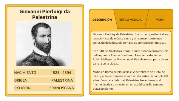 1. - ¿Cuál es el origen de Giovanni Pierluigi da Palestrina? (1 punto)----------------------------------------------------------------------------------- 2. - En el año ____, se trasladó a _______, donde estudió en la escuela del ____________ ______________ ____________ (4 puntos) 3. - Murió en _______ de pleuresía (1 punto) 4. - Palestrina fue enterrado el mismo día de su muerte, en un ataúd __________ con una placa de ________. (2 punto)