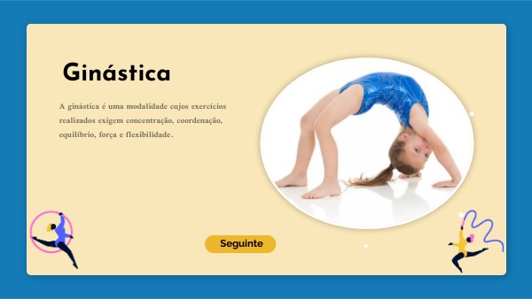 A ginástica é uma modalidade cujos exercícios realizados exigem concentração, coordenação, equilíbrio, força e flexibilidade.