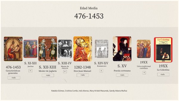 La literatura medieval es aquella desarrollada principalmente en Europa desde la caída del Imperio Romano de Occidente (siglo V) hasta el Renacimiento (siglo XV), es decir, el periodo correspondiente a los mil años que duró la Edad Media. Como apunte, fue en este periodo cuando se dieron las primeras manifestaciones literarias en castellano, coincidiendo con la Reconquista de los cristianos frente a los reinos musulmanes, lo que contribuyó a la extensión de la lengua por el territorio. la literatura medieval se caracteriza principalmente por: • Literatura religiosa (emanada de la iglesia) y literatura profana o laica (emanada del pueblo y mucho menos abundante). Predomina la primera. • Muchos textos anónimos. • Importante marca de oralidad, pues se escribía para ser recitado o cantado. • Carácter didáctico: los autores de las producciones literarias deseaban enseñar y moralizar. • Géneros: drama, fábulas, lírica y novela (a finales) En cuanto a obras representativas encontramos el cantar de mio cid: "Veo tres emires moros, estar a mi alrededor,no lo demoréis más, dos id para allá,tres mil moros llevad con armas de combatir,con los de la frontera que os ayudarán,cogédmelo con vida, traédmelo delante,porque entró en mi tierra, derecho me habrá de pagar"