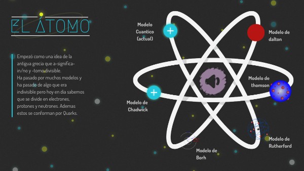 Empezó como una idea de la antigua grecia que a-significa-in/no y -tomo divisible.Ha pasado por muchos modelos y ha pasado de algo que era indivisible pero hoy en dia sabemos que se divide en electrones, protones y neutrones. Ademas estos se conforman por Quarks.