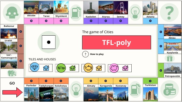 Each player must choose a color: blue, green, yellow or pink. He/she gets a tile to mark his/her position and 10 houses to indicate the properties he/she acquires during the game. Each player must take the tile of his/her color and place it on the starting square. To start playing, click on the dice and move your piece to the corresponding square. In each square there must be one or more questions. If you get it right, place one of your houses on that square - congratulations, you have a new property! Special squares: the squares with icons contain penalties such as "Player pays electricity tax: loses 2 houses". Get the question right to avoid the penalty! The player who has the highest number of houses on the board once all the squares are occupied wins.