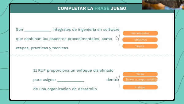 El RUF proporciona un enfoque disiplinado para asignar _____________ dentro de una organizacion de desarrollo.