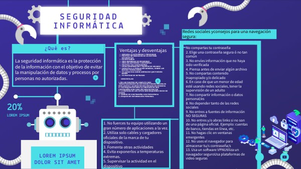 No compartas tu contraseña2. Elige una contraseña segura ó no tan común 3. No envíes información que no haya sido verificada 4. Piensa antes de enviar algún archivo 5. No compartas contenido inapropiado y/o delicado 6. En caso de que un menor de edad esté usando redes sociales, tener la supervisión de un adulto 7. No compartir información o datos personal/es 8. No depender tanto de las redes sociales 9. No entres a fuentes de información NO SEGURAS 10. No entres y/o abras links si no son de una página oficial. Ejemplo: cuentas de banco, tiendas en línea, etc. 11. No hagas clic en ventanas emergentes 12. No uses el navegador para almacenar tu/s contraseña/s 13. Usa un software VPNUtiliza un navagador seguroUsa plataformas de video seguras