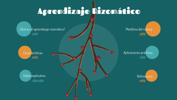 La metáfora del aprendizaje rizomático se compara con el sistema de raíces de una planta llamado "rizoma". En lugar de tener una raíz central y ramificaciones lineales, el rizoma es un sistema de raíces interconectadas que se expanden en múltiples direcciones. De manera similar, el aprendizaje rizomático se caracteriza por su naturaleza no lineal y descentralizada, donde el conocimiento se extiende y se conecta en diversas direcciones, permitiendo múltiples caminos de exploración y aprendizaje. La única divergencia con la metáfora del rizoma es que, como personas, podemos formarparte de varias comunidades y por tanto nutrirnos y aportar de manera diferente en cadauna de ellas