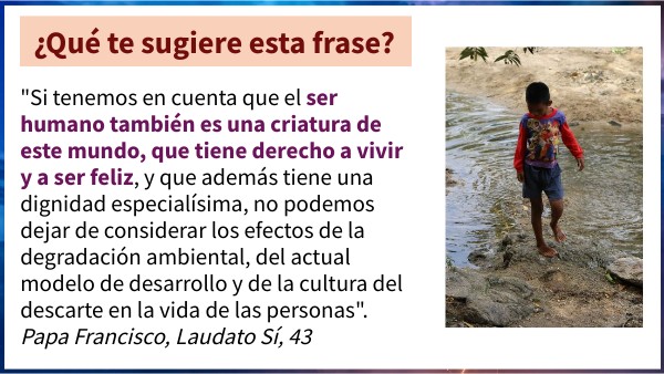 "Si tenemos en cuenta que el ser humano también es una criatura de este mundo, que tiene derecho a vivir y a ser feliz, y que además tiene una dignidad especialísima, no podemos dejar de considerar los efectos de la degradación ambiental, del actual modelo de desarrollo y de la cultura del descarte en la vida de las personas". Papa Francisco, Laudato Sí, 43