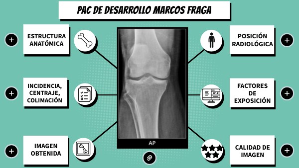 - Colocaremos el chasis encima de la mesa bajo la pierna del paciente.- Mantendremos una distancia de tubo de un metro. - El rayo central incidirá de forma perpendicular al plano de apoyo. - El centraje se realizará sobre el hueso de la rótula. - La colimación ha de incluir el tercio distal del fémur hasta el tercio proximal de tibia y peroné.