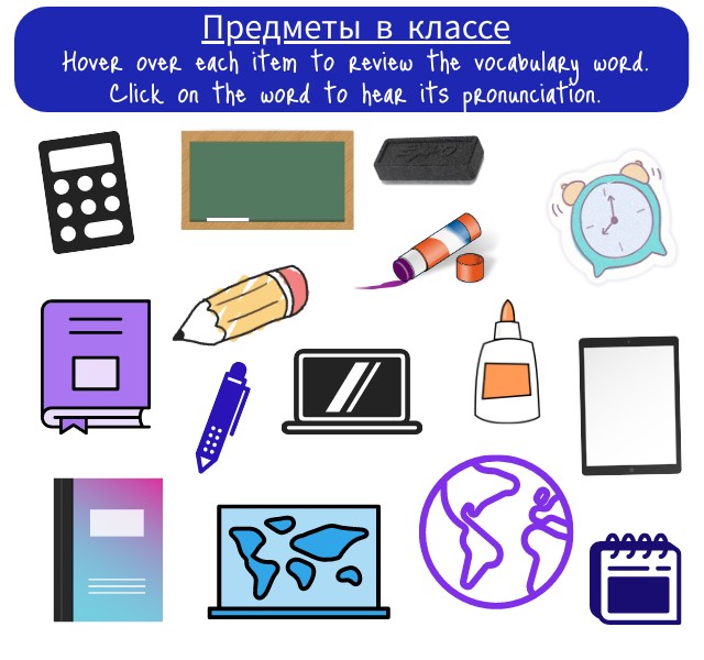 Предметы в классеHover over each item to review the vocabulary word. Click on the word to hear its pronunciation.
