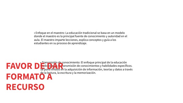 • Transmisión de conocimiento: El enfoque principal de la educación tradicional es la transmisión de conocimientos y habilidades específicos. Se pone énfasis en la adquisición de información, teorías y datos a través de la lectura, la escritura y la memorización.