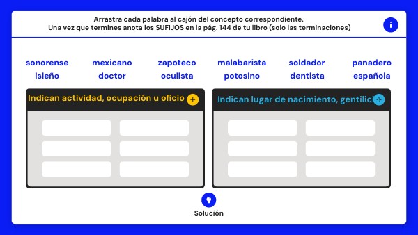 Arrastra cada palabra al cajón del concepto correspondiente. Una vez que termines anota los SUFIJOS en la pág. 144 de tu libro (solo las terminaciones)
