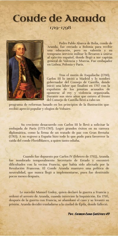 programa de reformas basado en los principios de la Ilustración que recibió aprecio popular y elogios de Voltaire. Su creciente desacuerdo con Carlos III le llevó a solicitar la embajada de París (1773-1787). Logró grandes éxitos en su carrera diplomática, como la firma de un tratado de paz con Gran Bretaña (1783). A su regreso a España hizo todo lo que pudo para favorecer la caída del conde Floridblanco, a quien tanto odiaba. Cuando fue depuesto por Carlos IV (febrero de 1792), Aranda fue nombrado temporalmente Secretario de Estado y encontró dificultades con la vecina Francia, que había sido afectada por la Revolución Francesa. El Conde Aranda mantuvo una política de neutralidad, que nunca llegó a implementarse, pues fue destituido pocos meses después. Le sucedió Manuel Godoy, quien declaró la guerra a Francia y ordenó el arresto de Aranda, cuando intervino la Inquisición. En 1795, después de la guerra con Francia, se abandonó el caso y se levantó su prisión. Aranda decidió trasladarse a la ciudad de Épila, donde falleció.