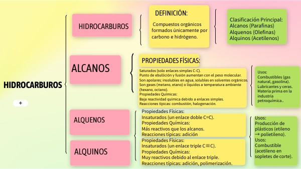 Saturados (solo enlaces simples C-C).Punto de ebullición y fusión aumentan con el peso molecular. Son apolares; insolubles en agua, solubles en solventes orgánicos. Son gases (metano, etano) o líquidos a temperatura ambiente (hexano, octano). Propiedades Químicas: Baja reactividad química debido a enlaces simples. Reacciones típicas: combustión, halogenación.