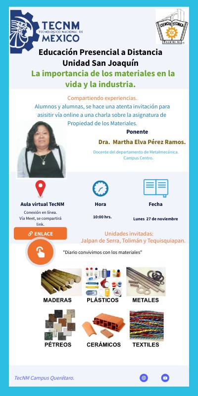 Compartiendo experiencias.Alumnos y alumnas, se hace una atenta invitación para asisitir vía online a una charla sobre la asignatura de Propiedad de los Materiales. El