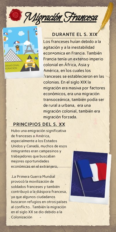 Los franceses huían debido a la agitación y a la inestabilidad econ+omica en Francia. También Francia tenía un extenso imperio colonial en África, Asia y América, en los cuales los franceses se establecieron en las colonias. En el siglo XIX la migración era masiva por factores económicos, era una migración transoceánica, también podía ser de rural a urbana, era una migración colonial, también era migración forzada.