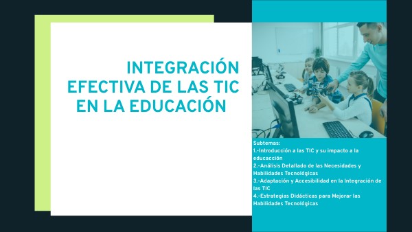 Subtemas: 1.-Introducción a las TIC y su impacto a la educacción 2.-Análisis Detallado de las Necesidades y Habilidades Tecnológicas 3.-Adaptación y Accesibilidad en la Integración de las TIC 4.-Estrategias Didácticas para Mejorar las Habilidades Tecnológicas