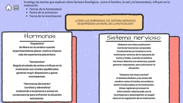 *Dopamina* Se libera en el cerebro cuando experimentamos placer, motiva a buscar más de experiencia placentera. *Serotonina* Regula el estado de animo e influye en la moticacion sus niveles equilibrados generan mayir disposicion a ganar recompensas. *Hormonas del estrés* (cortisol y adrenalina) motivando a la persona a actuar en consecuencia para enfrentar la situación estresante.