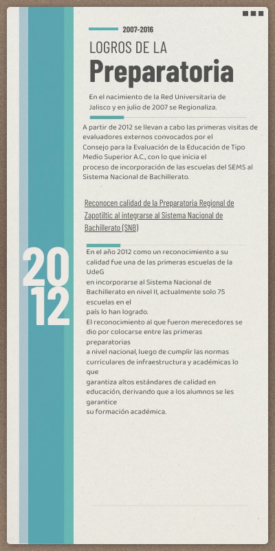 En el año 2012 como un reconocimiento a su calidad fue una de las primeras escuelas de la UdeG en incorporarse al Sistema Nacional de Bachillerato en nivel II, actualmente solo 75 escuelas en el país lo han logrado. El reconocimiento al que fueron merecedores se dio por colocarse entre las primeras preparatorias a nivel nacional, luego de cumplir las normas curriculares de infraestructura y académicas lo que garantiza altos estándares de calidad en educación, derivando que a los alumnos se les garantice su formación académica.