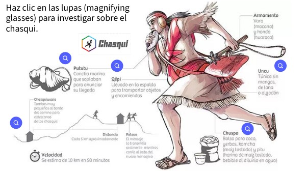 Haz clic en las lupas (magnifying glasses) para investigar sobre el chasqui.