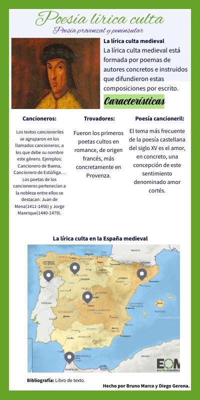 La lírica culta medieval está formada por poemas de autores concretos e instruidos que difundieron estas composiciones por escrito.