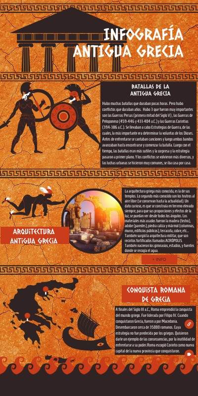 La arquitectura griega más conocida, es la de sus templos. Lo segundo más conocido son los teatros al aire libre (se conservan hasta la actualidad). Un dato curioso, es que se construía en terreno elevado siempre, para que sus proporciones y efectos de la luz, se puedan ver desde todos los ángulos. Los materiales más usados fueron la madera (techo), adobe (paredes), piedra caliza y mármol (columnas, muros, edificios públicos), terracota, cobre, etc...También surgió la arquitectura militar, que son recintos fortificados llamados ACRÓPOLIS. También nacieron los gimnasios, estadios, y fuentes donde se recogía el agua.